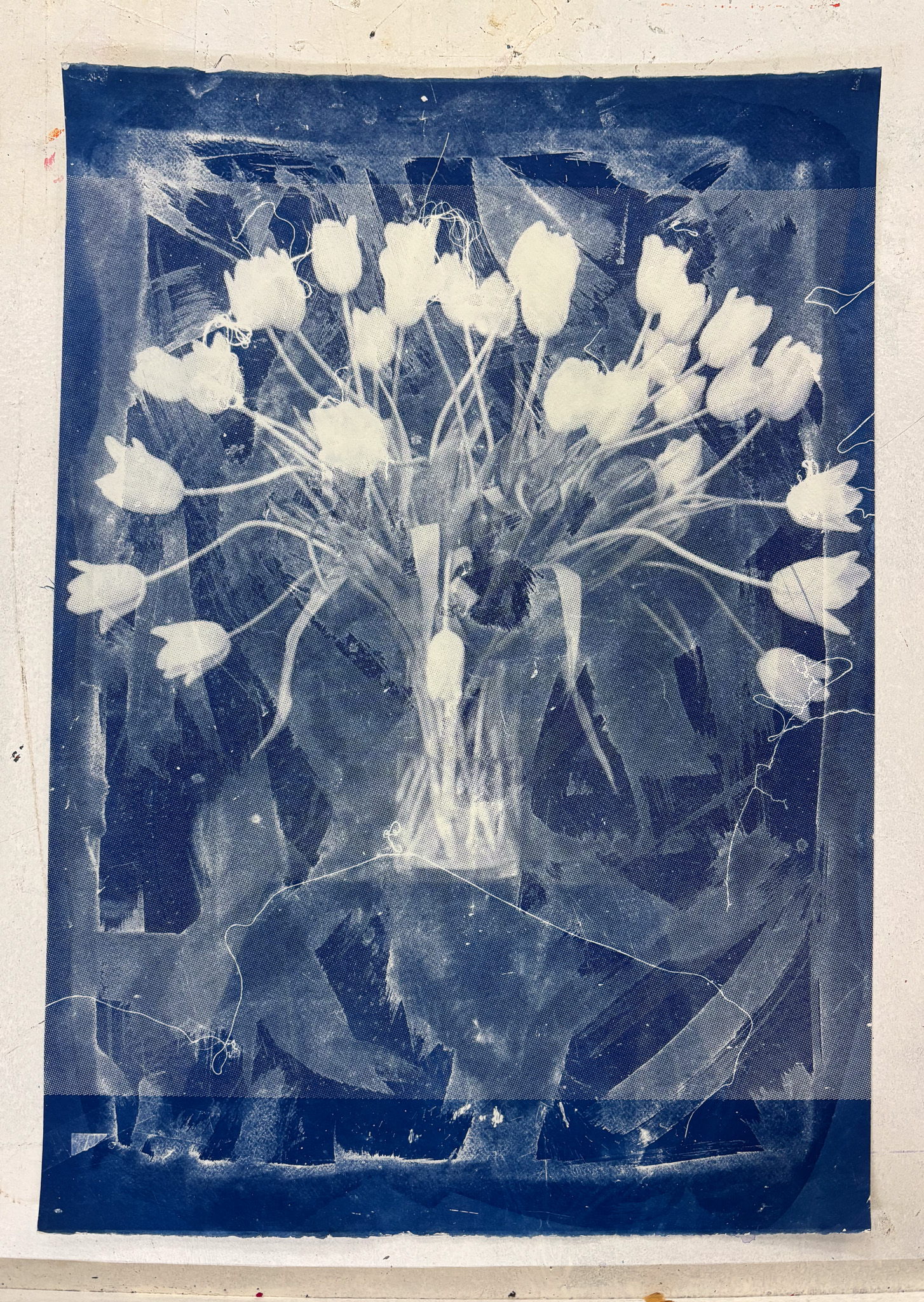 Handmade Cyanotype print. Exposed with light, developed in water.