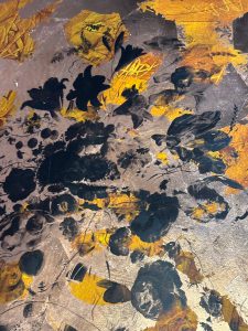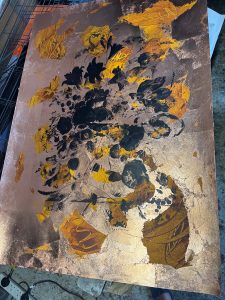 Screen Print over shiny copper leaf. Background is painted and screen printed